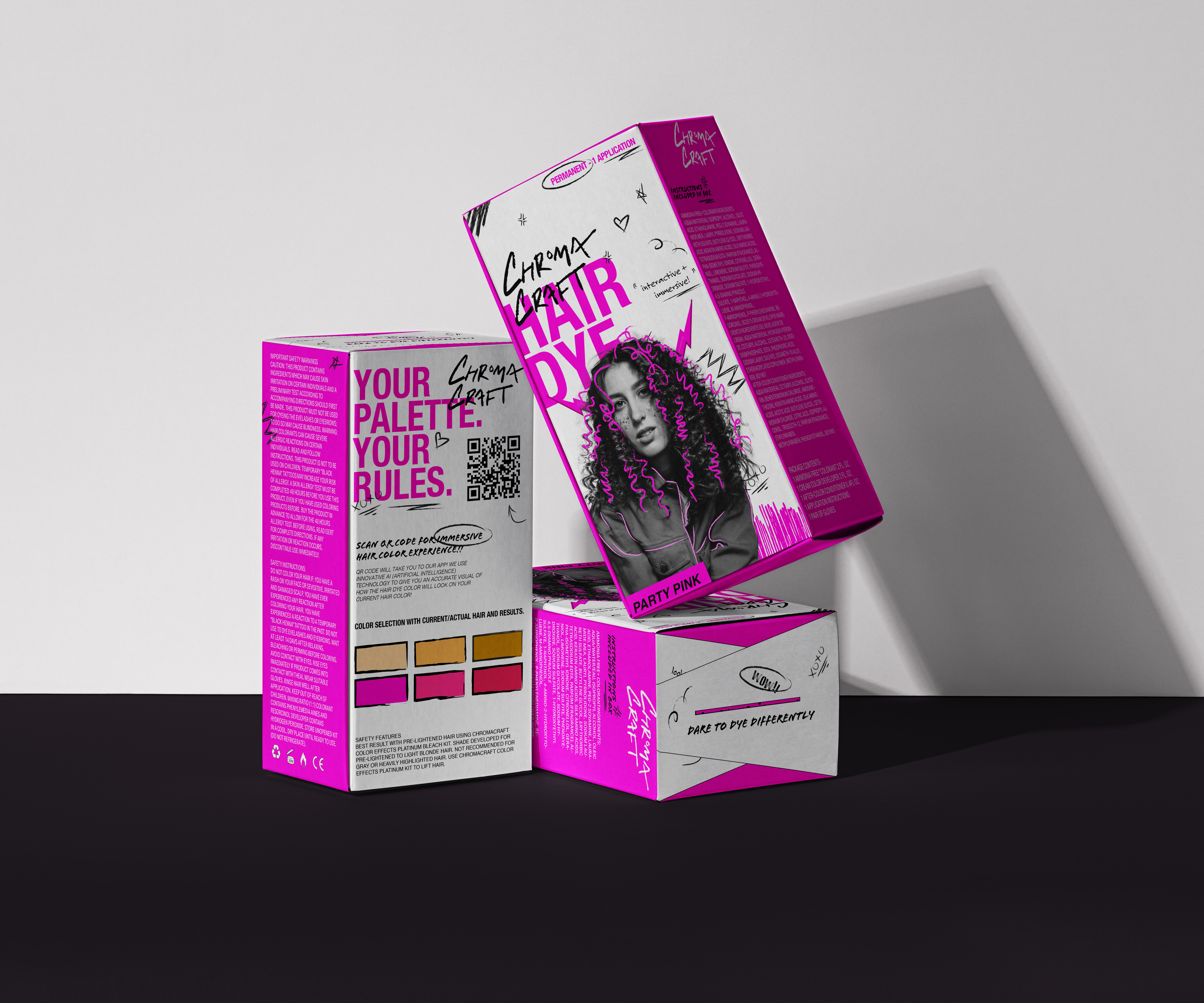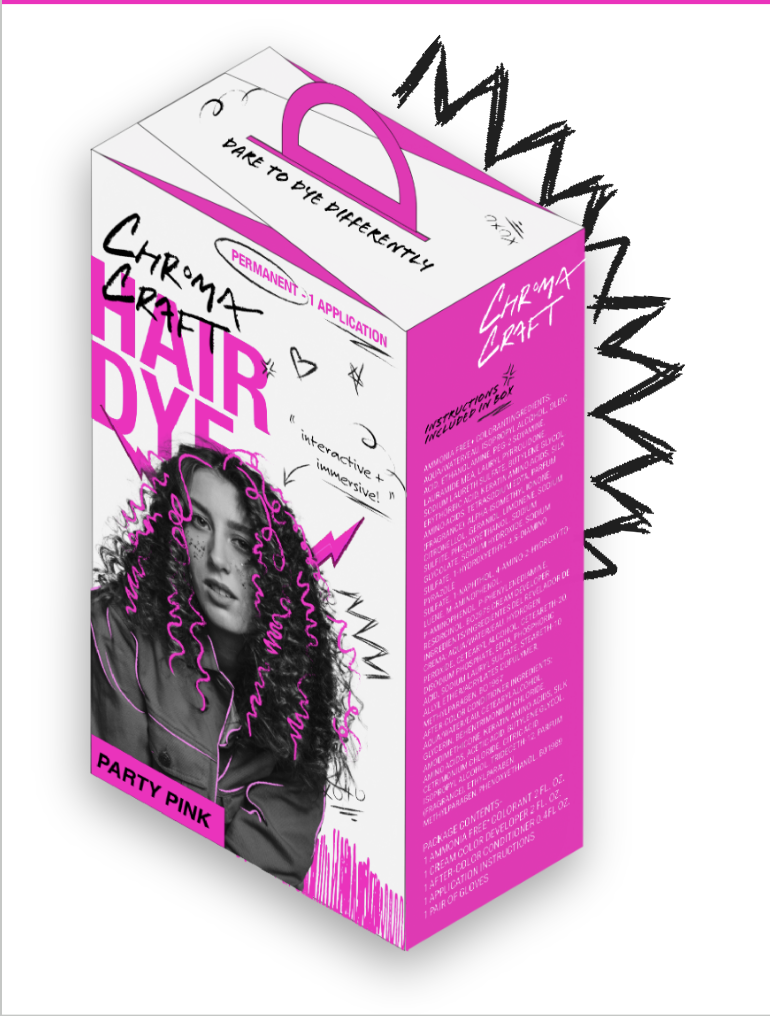 Vibrant, bold, and unapologetic. Chroma Craft needed a brand identity that encapsulated their fearless approach to hair dye while celebrating self-expression and creativity. I developed a visual language that fuses vivid colors with graffiti-inspired designs, transforming hair dye into a powerful tool for authenticity. The branding balances playful aesthetics with a rebellious spirit, appealing to trendsetters who dare to challenge conventional beauty norms.